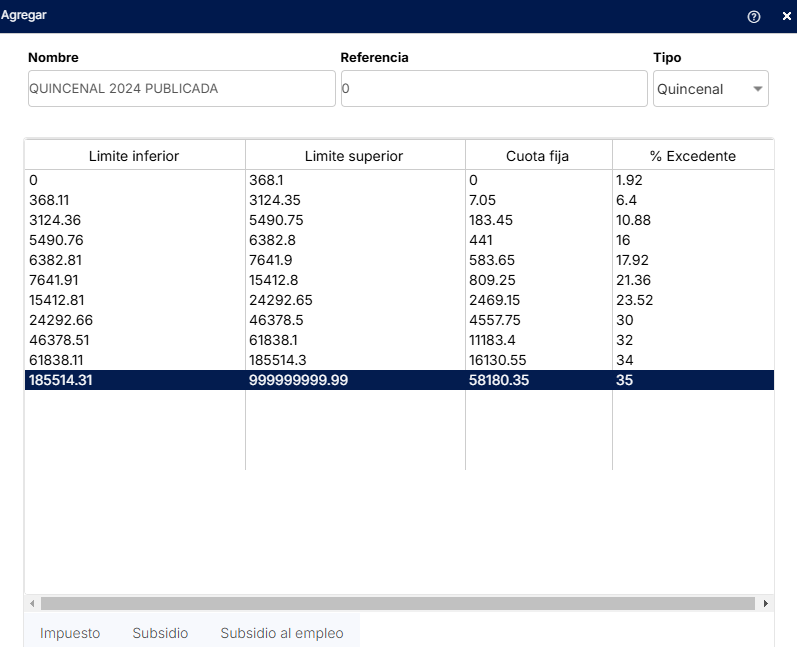 Al agregar una nueva tabla de impuestos hay que colocar un Nombre y Referencia que la podamos referenciar, en el campo Tipo seleccionaremos de las opciones que Semanal, Quincenal, Mensual y Anual según a lo que corresponda nuestra periodicidad de nómina.